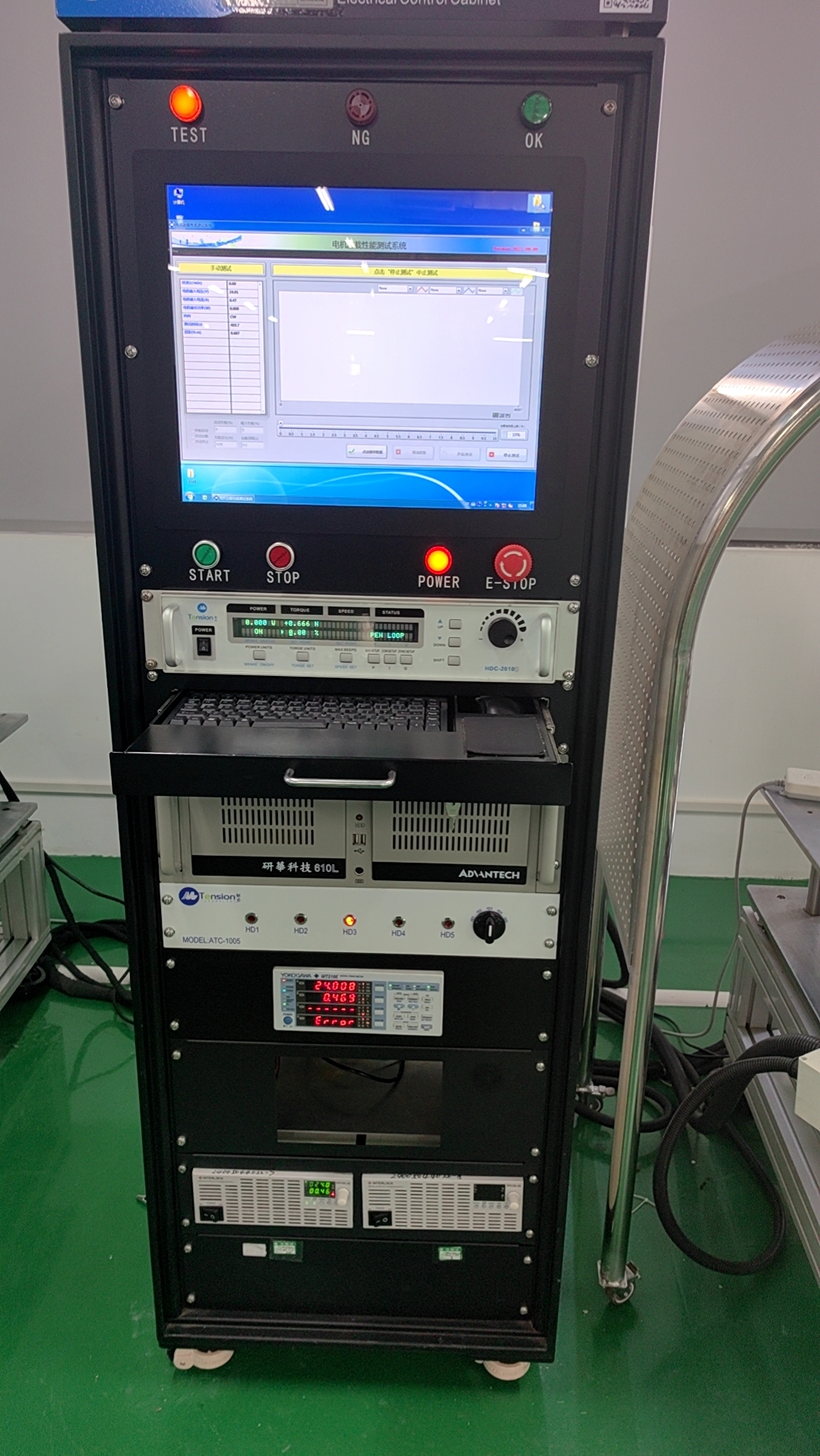 低壓直流電源、電流傳感器、轉(zhuǎn)矩轉(zhuǎn)速傳感器等測試設(shè)備用于電機(jī)檢測,現(xiàn)場圖片如下: