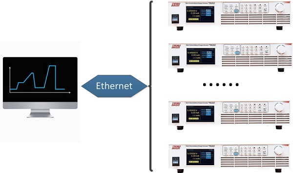 當(dāng)需要多串電池芯時(shí),可多臺(tái)電池模擬器多通道串聯(lián)使用,使用者亦可通過(guò)Ethernet標(biāo)準(zhǔn)界面進(jìn)行遠(yuǎn)端控制及其他自動(dòng)測(cè)試應(yīng)用。
