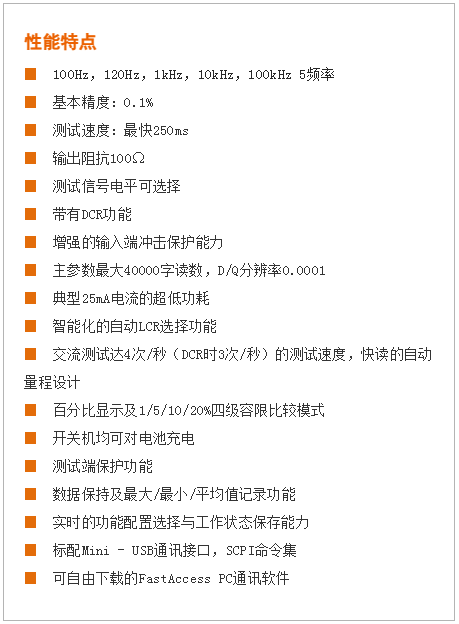 TH2822系列手持式LCR數(shù)字電橋采用超低功耗設(shè)計(jì)和高密度SMD裝配工藝,主副參數(shù)同時(shí)顯示的帶背光LCD顯示器,清新炫麗的一次成型雙色外殼,操作功能簡潔明了,測試信號(hào)頻率最高可到100kHz,主參數(shù)40000字讀數(shù)及損耗因子0.0001的分辨率,在任何場所可長時(shí)間實(shí)現(xiàn)對無 源元件進(jìn)行精確而便捷的測量。